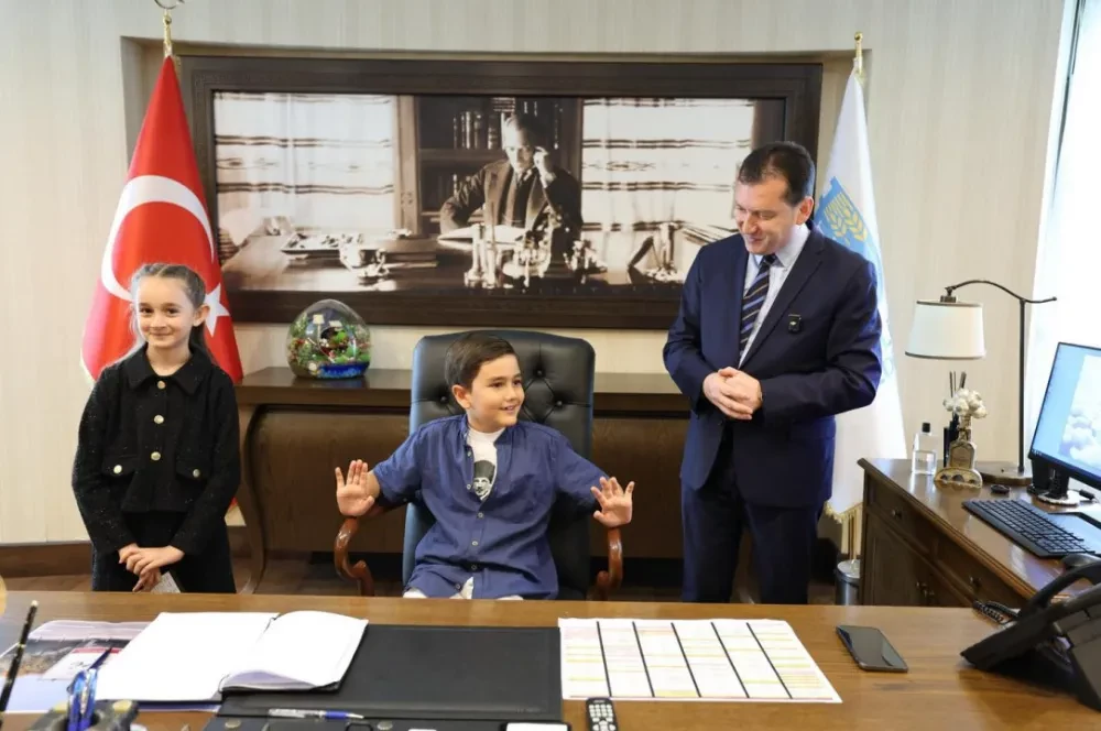 Başkan Balcıoğlu'nun koltuğu devrettiği çocuklardan duru, çocuk parklarına meyve bahçesi yapılmasını, Umutcan ise spor alanlarının artırılması, Mete ise denizin daha temiz hale getirilmesi için belediye başkan yardımcılarına talimat verdi.