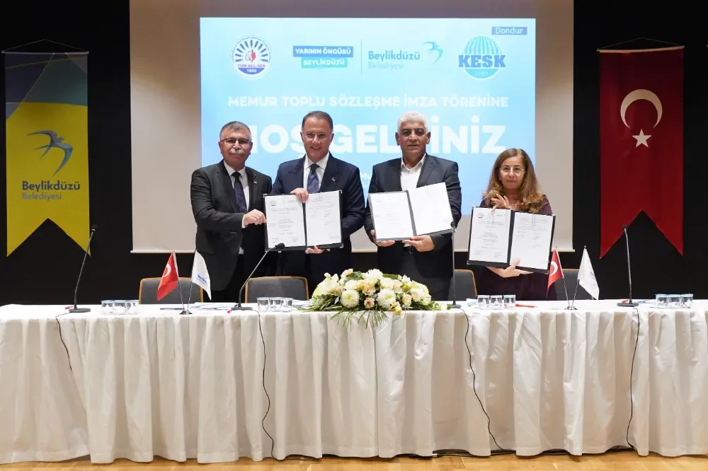 Kamu emekçilerinin haklarını korumak ve demokratik bir düzende çalışmalarını sağlamak amacıyla çalışmalarını sürdüren Beylikdüzü Belediyesi, Tüm Bel-Sen ile Toplu İş Sözleşmesi imzaladı. Beylikdüzü Atatürk Kültür ve Sanat Merkezi'nde kamu emekçilerinin katılımı ile gerçekleşen imza törenine;  Beylikdüzü Belediye Başkanı Mehmet Murat Çalık'ın yanı sıra CHP Beylikdüzü İlçe Başkanı Mülayim Demirtaş, Tüm Bel-Sen 1 No'lu Şube Başkanı Meryem Göktepe, Tüm Bel –Sen Genel Başkanı Erdal Bozkurt ve KESK Eş Başkanı Ahmet Karagöz katıldı. İmzalanan sözleşme ile Beylikdüzü Belediyesi'nde en düşük devlet memuru maaşı ortalama 63 bin TL olurken, ikramiye sayısı 7'ye çıkarıldı ve yan haklarda iyileştirmeler yapıldı.