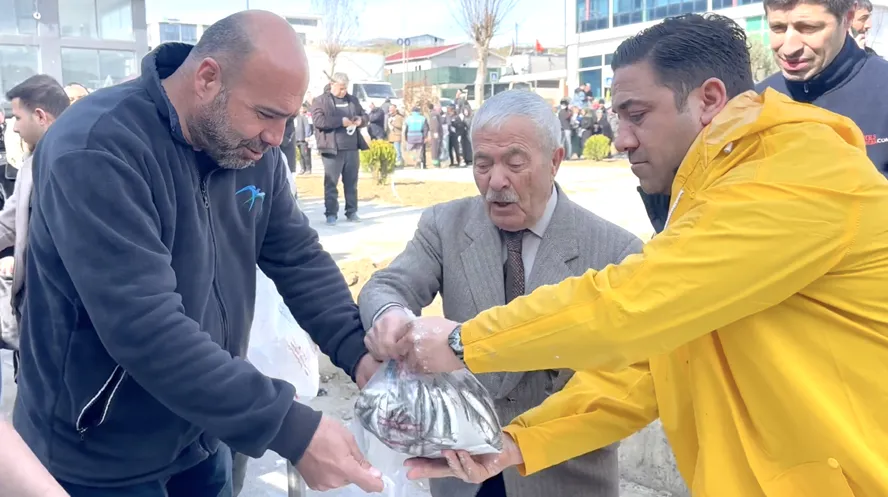 “Ramazan bereketini verdi. 3 tır hamsimiz var. Birinci tır bitti. Her gelene 2 kilo bedava ikram ediyoruz. Halkımıza hayırlı Ramazanlar diliyorum. Tırlar bitene kadar devam edeceğiz. Balık bolluğu sürerse yarın da dağıtıma devam edeceğiz. Gazi Mustafa Kemal Atatürk’ün ruhu için. Şehitlerimizin ruhu için. Gazilerimizin sağlığı için. Mübarek ramazan ayında hamsi ikram ediyoruz.”