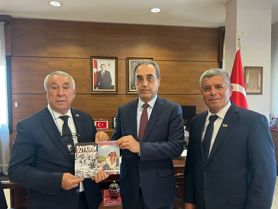 Serdar Ünsal Başkonsolos Asip Kaya’ya kendi yazdığı Yüreğim İrevanda Kaldı ve Soykırım kitabı ile Cam üzerine işlenmiş Türkiye Azerbaycan bayraklarının olduğu bir resim hediye etti.