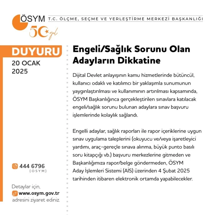 ÖSYM, engelli adaylar, sağlık raporları ile rapor içeriklerine uygun sınav uygulama taleplerini (okuyucu ve/veya işaretleyici yardımı, araç-gereçle sınava alınma, büyük punto basılı soru kitapçığı vb.) başvuru merkezlerine gitmeden ve Başkanlığımıza rapor/belge göndermeden, ÖSYM Aday İşlemleri Sistemi (AİS) üzerinden 4 Şubat 2025 tarihinden itibaren elektronik ortamda yapabileceklerini duyurdu.