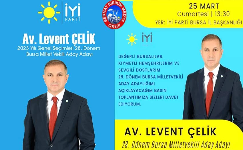 Çevresinde ve hemşehri camiasında sevilen, sayılan Av. Levent ÇELİK 14 Mayıs’ta yapılacak Cumhurbaşkanlığı ve Genel seçimlerinde İYİ Parti Bursa Milletvekili A. Adayı oldu.