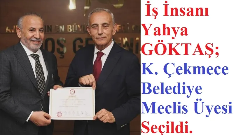 31 Mart 2024 tarihinde yapılan yerel seçimlerde Çekmecede oturan Kars Ardahan Iğdır’lı hemşhrilerinin ve dostlarının oyları alarak CHP K. Çekmece Belediye Başkanı Kemal Çebi’nin Kazanmasına önemli katkıları olan İş insanı Yahya GÖKTAŞ; K. Çekmece Belediye Meclis üyesi seçilip mazbatasını alarak 1 Nisandan sonra görevine başladı.
