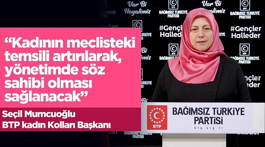 Bağımsız Türkiye Partisi (BTP) Genel Başkan Yardımcısı Seçil Mumcuoğlu 8 Mart Dünya Kadınlar Günü nedeniyle yaptığı açıklamada, “Bağımsız Türkiye Partisi olarak biz, kadınlara yaşatılan bu haksızlıklara son vermeye projelerimizle hazırız. Genel Başkanımızın Cumhuriyet Bayramı’nda ilan ettiği şekilde, milletvekili listelerimizin 400’ü 40 yaşın altındaki gençlerden oluşacak ve bunların yarısı kadın, yarısı erkek olacak. Kadının meclisteki temsili artırılarak, yönetimde söz sahibi olması sağlanacak” dedi.