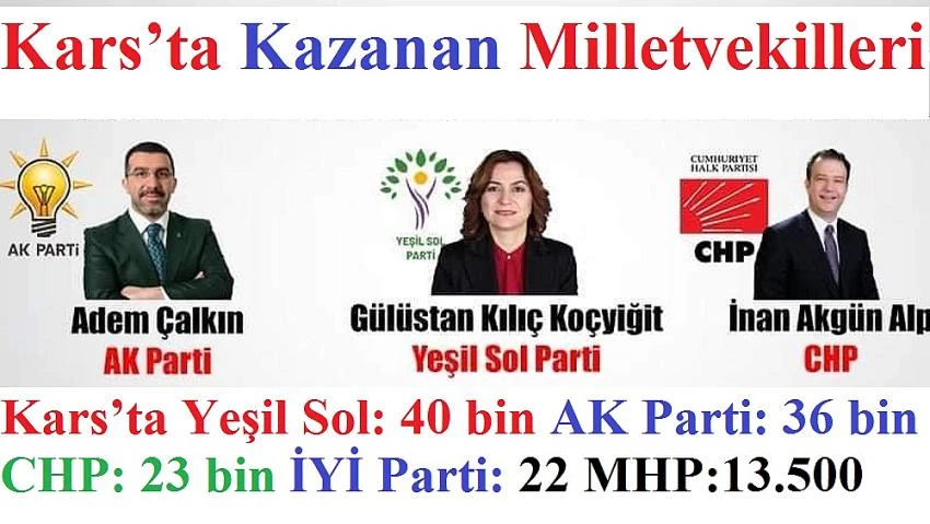 Kars’ta Açılan sandık sayısı 95 Yeşil Sol: 40 bin AK Parti: 36 bin CHP: 23 bin İYİ Parti: 22 MHP: 13.5 aldı.