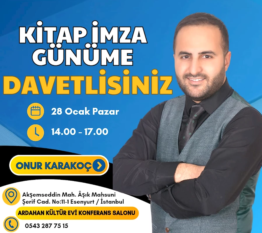 Yeni çıkan kitabının imza gününe dost, arkadaş ve hemşehrilerini davet eden Yazar onur Karakoç, Bu özel günümde sizi aramızda görmek, kitabımı size özel olarak imzalamak benim için çok kıymetli olacak ve bizi onurlandıracaktır. dedi